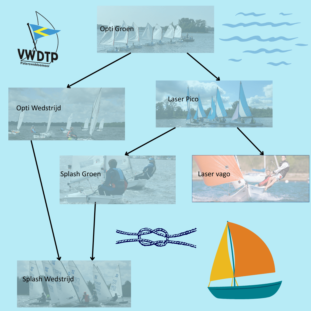 Hierboven staat een diagram om het doorstroming binnen het jeugdzeilen te laten zien. Bij vragen of onzekerheden kunt u een mailtje sturen naar jeugdzeilen@vwdtp.nl of een appje sturen naar de desbetreffende trainer.